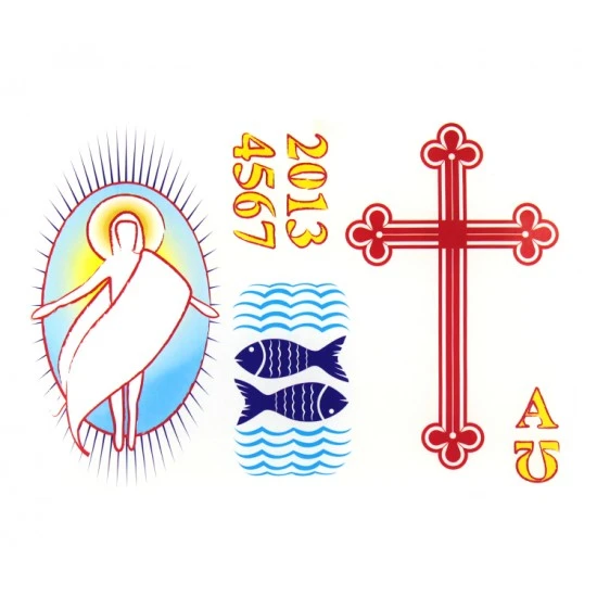 Adesivo per Cero Pasquale con la raffigurazione del Gesù Risorto e dei Pesci. Fornito completo dei numeri per comporre l’anno in corso, una croce e le simbologie liturgiche dell’alfa ed omega. Può essere utlizzato sui ceri di cera o su quelli in plastica. Made in Italy