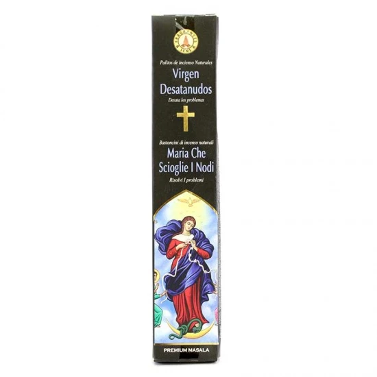 Bastoncini di incenso Madonna dei Nodi – Incenso religioso naturale arrotolato a mano di ottima qualità e gradevole profumazione, fornito confezionato in scatola di cartone decorata.