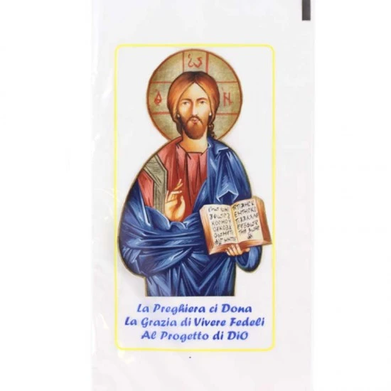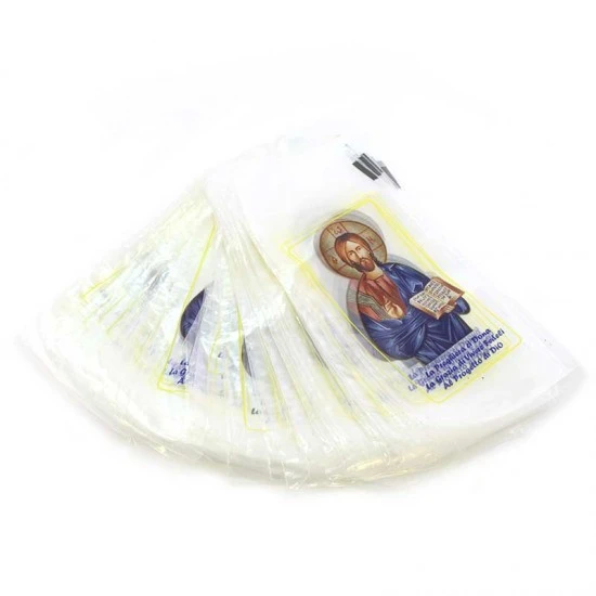 Bustina per ulivo con frase e raffigurazione di Cristo. Realizzata in pvc leggero trasparente con comoda apertura superiore per consentire l’inserimento del rametto di ulivo. Inoltre porta un foro che permette di appendere comodamente la bustina al muro. Made in Italy