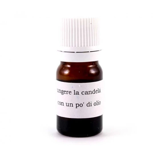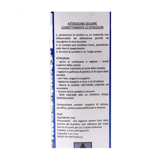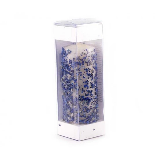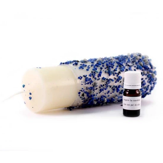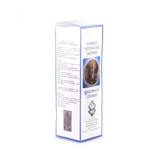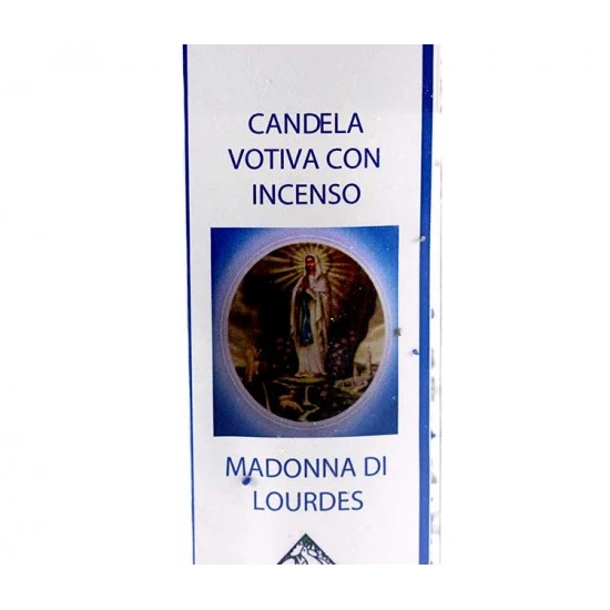 Candela votiva Madonna di Lourdes con decorazione di grani di incenso colore blu. Fornita completa di olio per ungere lo stoppino e confezionata in scatola di plastica trasparente.