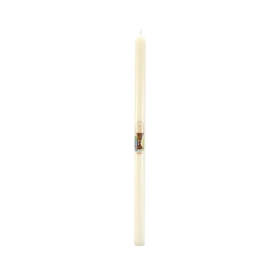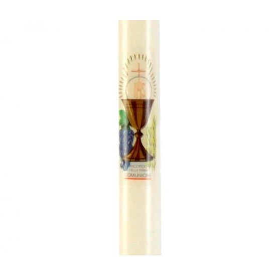 Candela per la Prima Comunione con decalcomania di simboli Eucaristici (calice, uva, spighe) e scritta Ricordo della Prima Comunione. Made in Italy
