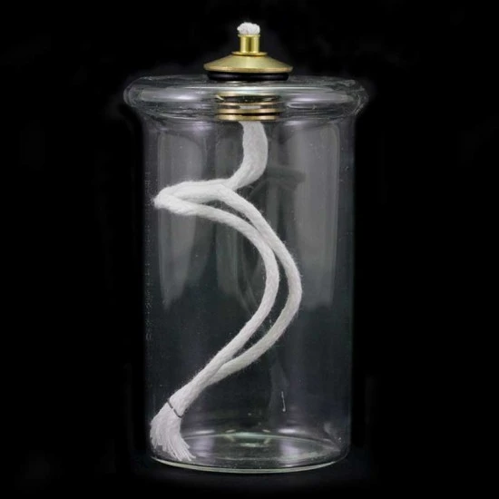 Cartuccia a cera liquida realizzata in pyrex, si adatta alle candele in plastica dal diametro 6 cm al 8 cm, fornita completa di gigler in ottone dorato e stoppino.