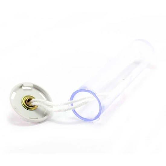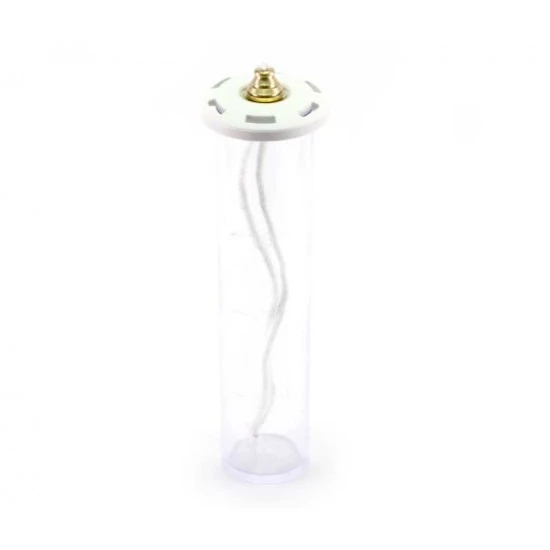 Cartuccia a cera liquida in policarbonato adatta alle candele dal diametro 5 cm, fornita di tappo con gigler e stoppino.