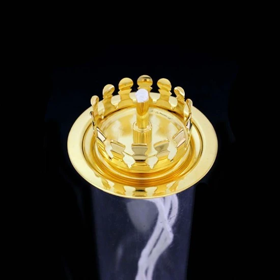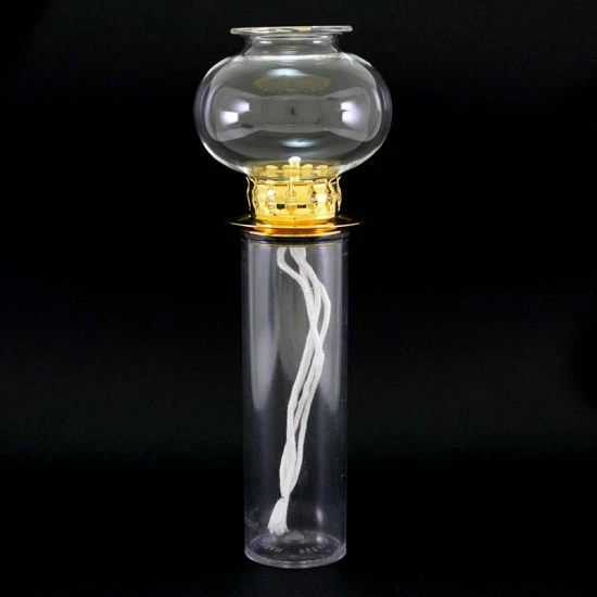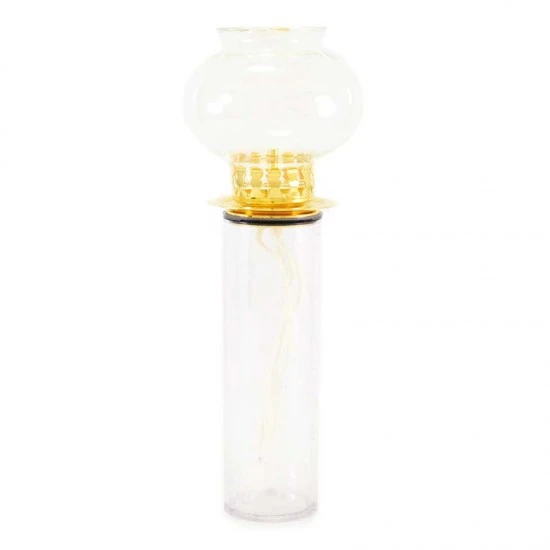 Cartuccia a cera liquida realizzata in plastica con antivento in vetro. La parte superiore della cartuccia è in ottone dorato, munita di stoppino e gigler.