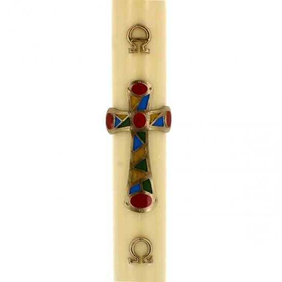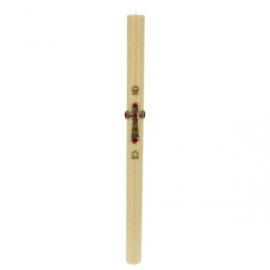 Cero Pasquale con decorazione di Croce colorata, Alfa e Omega a rilievo. Questo cero è realizzato in cera d’api di primissima qualità, si consuma in modo omogeneo e diffonde un delicato e gradevole profumo. Made in Italy