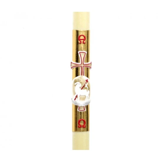 Cero Pasquale in cera d’api di primissima qualità realizzato con FOGLIA ORO applicata a mano e decorazione dell’agnello, alfa ed omega a rilievo. Colorazione Agnello bianco rosso con fondo oro. Diffonde un delicato e gradevole profumo di miele.