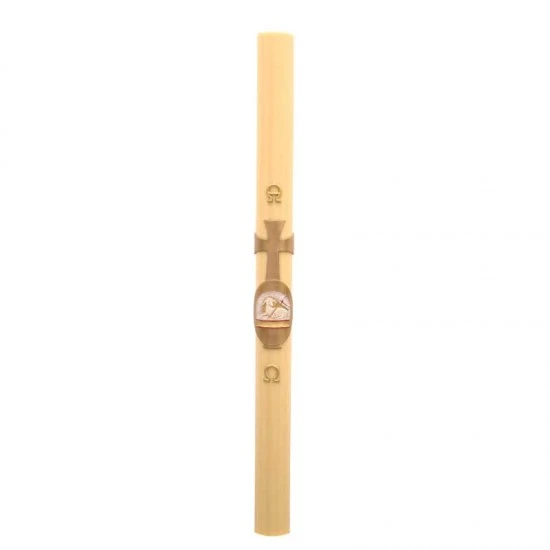 Cero Pasquale realizzato in cera d’api di primissima qualità che diffonde un delicato e gradevole profumo. Arricchito da decorazioni in cera a rilievo, Croce con agnello bianco e alfa e omega. Made in Italy
