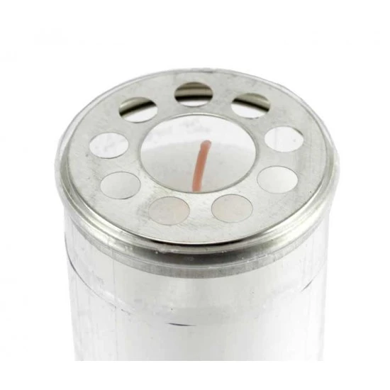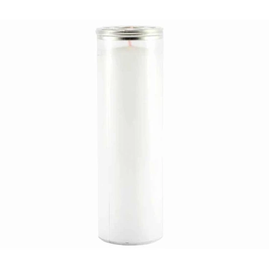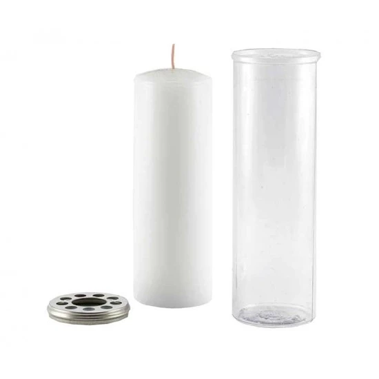 Cerone Liturgico in cera bianca con contenitore in plastica trasparente. La durata di 8 giorni (circa) è garantita dalla qualità della cera. Made in Italy