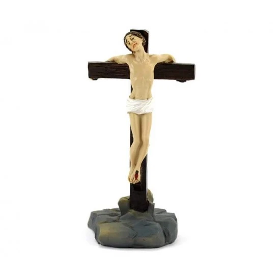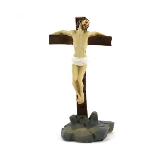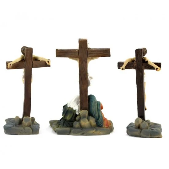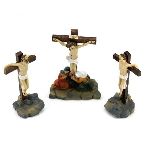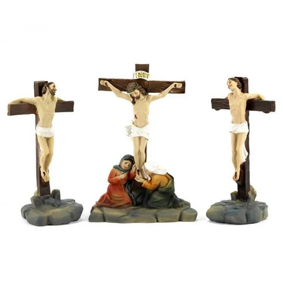 Crocifissione di Gesù. Scena raffigurante la Crocifissione di Gesù, realizzata interamente in resina colorata, composta da Gesù Crocifisso con i due ladroni. L’articolo è fornito completo di scatola litografata.