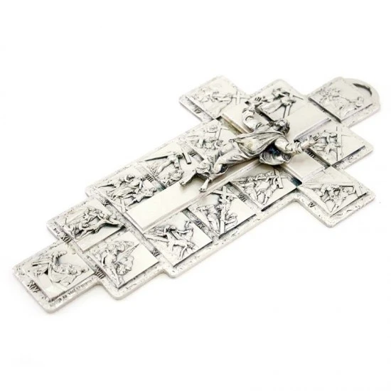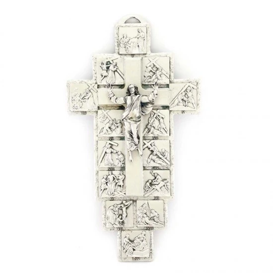 Crocifisso con Via Crucis realizzato interamente in metallo argentato. Al centro del Crocifisso vi è Cristo Risorto attorniato dalle 14 stazioni della Via Crucis. Prodotto di ottima fattura e ben rifinito nei particolari confezionato in elegante scatola di cartone. Made in Italy