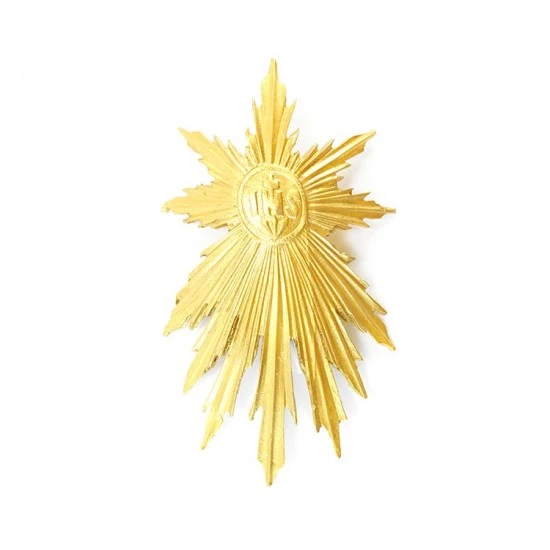 Decalcomania in cera dorata “IHS con raggi” per cero pasquale. Per essere applicata, questo tipo di decalcomania, va fissata direttamente sul cero con degli spilli riscaltati su fuoco. Made in Italy