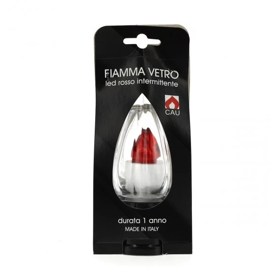 Fiamma in vetro con Candela elettronica led rosso intermittente durata 1 anno circa luce continua. Prodotto usa e getta funzionante a pile non sostituibili munito di interruttore di spegnimento. Made in Italy