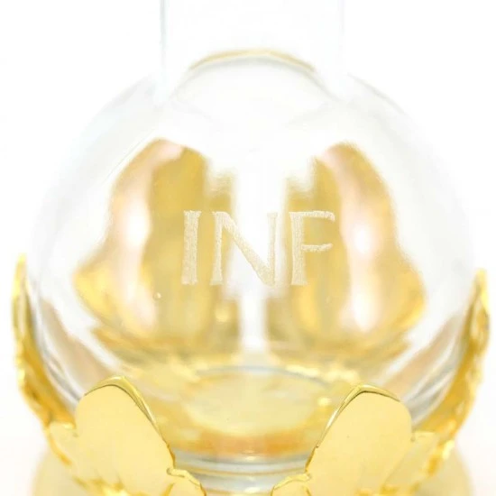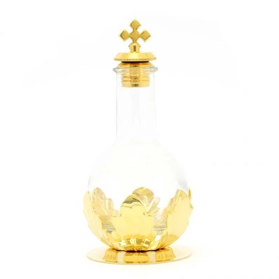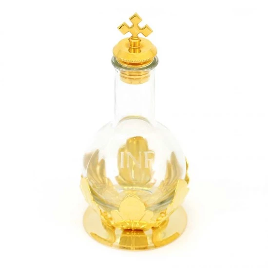 Fiaschetta per oli Santi in vetro con tappo a vite inserita su base in ottone dorato, capienza 100 cc. Made in Italy