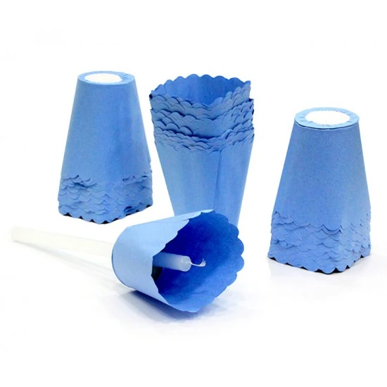 Flambeaux celeste in carta con base in cartoncino forato per un comodo inserimento delle candele da processione. Questo prodotto protegge la fiamma dal vento e le mani dal gocciolamento della candela. La confezione contiene 100 pezzi. Made in Italy