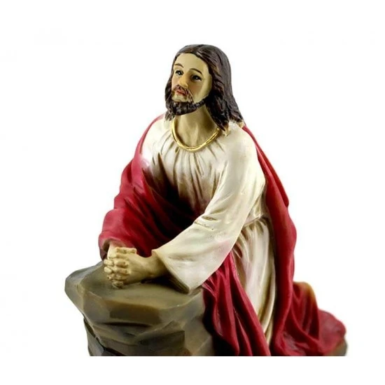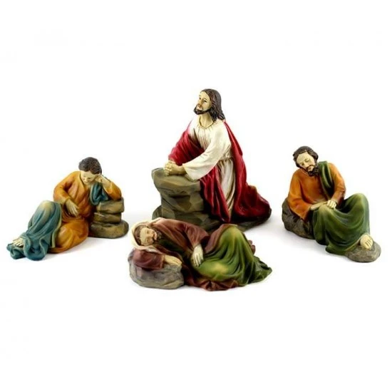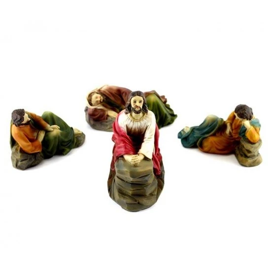 Gesù nell’orto degli ulivi. Scena raffigurante Gesù raccolto in preghiera nell’orto del Getsemani, realizzata interamente in resina colorata, composta da Gesù e tre Apostoli. L’articolo è fornito completo di scatola litografata.