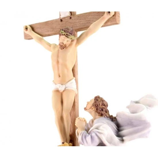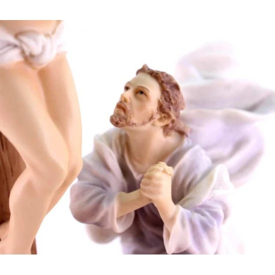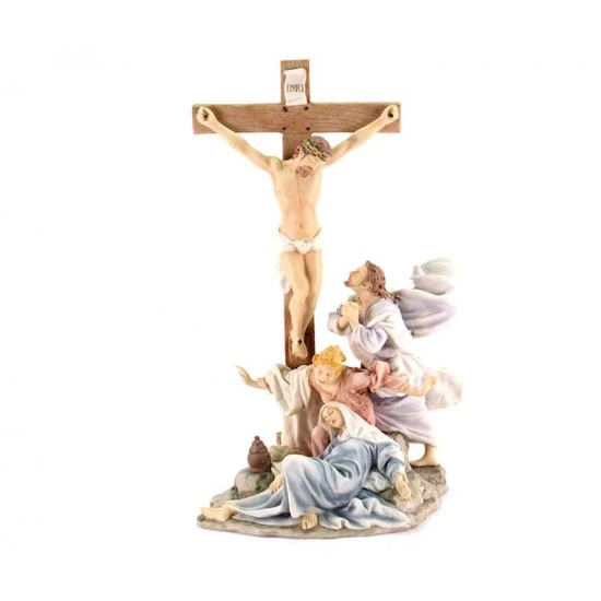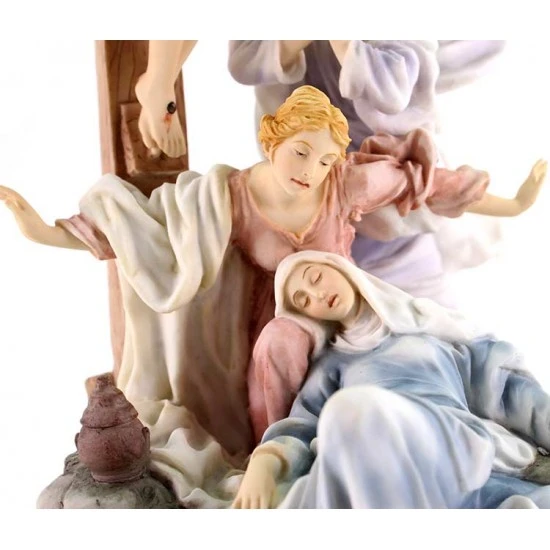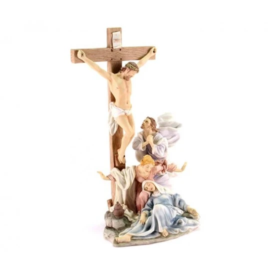 Gruppo Crocifissione di Gesù, scena realizzata interamente in resina piena colorata con colori molto tenui. Prodotto importato di ottima fattura e ben rifinito nei particolari. La statua è ben confezionata e corredata di elegante scatola.