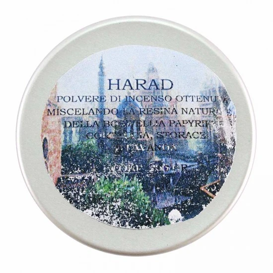 Harad polvere di incenso ottenuta miscelando la resina naturale della boswellia papyrifera, corteccia, storace e lavanda. Di ottima qualità e gradevole profumazione, confezionato in barattolo di plastica trasparente molto utile per preservare il prodotto dall’umidità.
