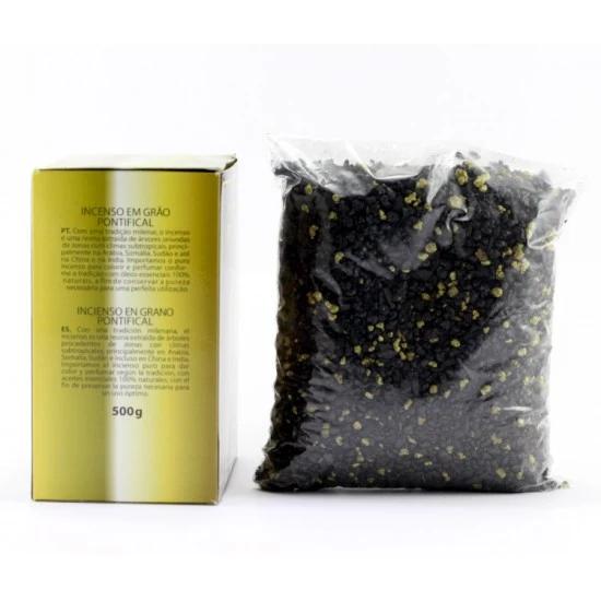 Incenso Pontifical composto da una resina naturale e pura che non subisce trasformazioni con l’aggiunta di prodotti chimici ma viene lavorata esclusivamente con prodotti naturali che donano a questa essenza una gradevole profumazione che può essere inalata senza provocare allergie.