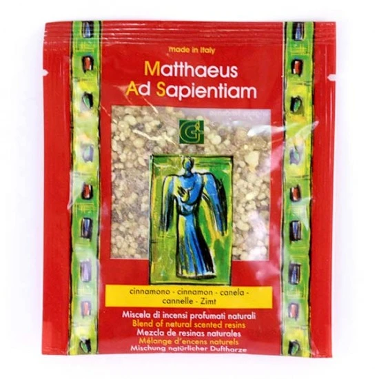 Incenso miscela Matthaeus di ottima qualità e gradevole profumazione di cinnamomo, confezionato in bustina litografata.