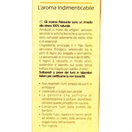 Incenso naturale di Palo Santo di ottima qualità e gradevole profumazione. Confezione contenente 6 bastoncini.