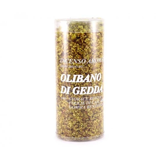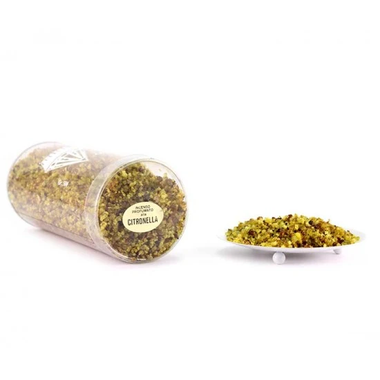 Incenso olibano di Gedda alla citronella. Di provenienza greca, questo tipo di incenso in granelli è di ottima qualità ed emana una gradevole e intensa profumazione. Confezionato in scatola trasparente.