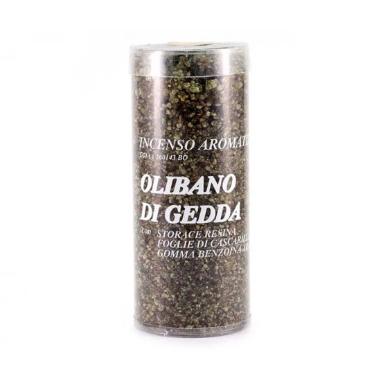 Incenso olibano di Gedda al patchouli. Di provenienza greca, questo tipo di incenso in granelli è di ottima qualità ed emana una gradevole e intensa profumazione. Confezionato in scatola trasparente.