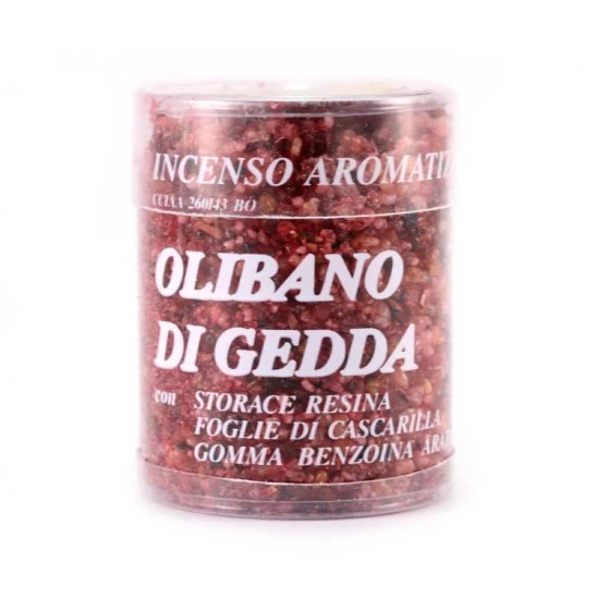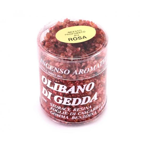 Incenso olibano di Gedda alla rosa. Di provenienza greca, questo tipo di incenso in granelli di color rosa è di ottima qualità ed emana una gradevole e intensa profumazione. Confezionato in scatola trasparente.
