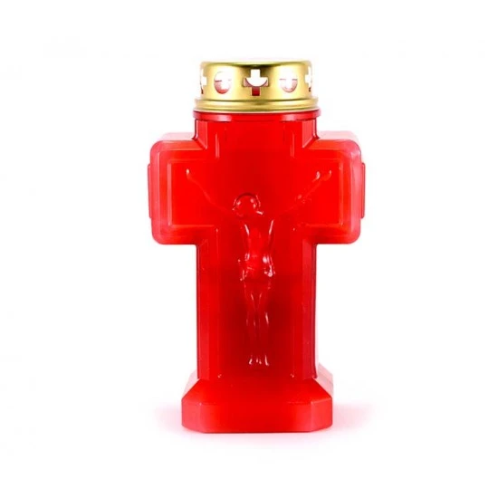 Lampada elettronica Croce rossa, realizzata in plastica rossa a forma di croce con raffigurazione a rilievo di Gesù Crocifisso. La lampada funziona a batterie incluse e non sostituibili ed emette una luce rosso tremolante. La durata delle batterie è di circa 150 giorni.