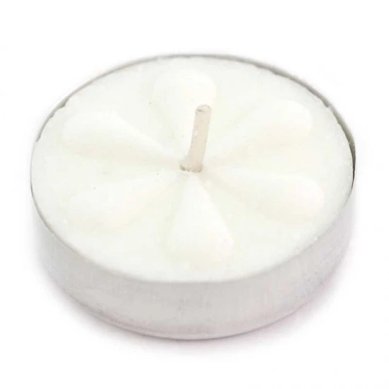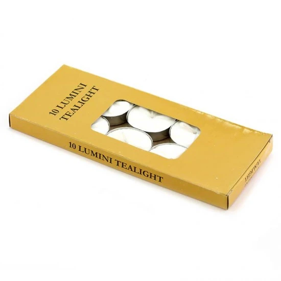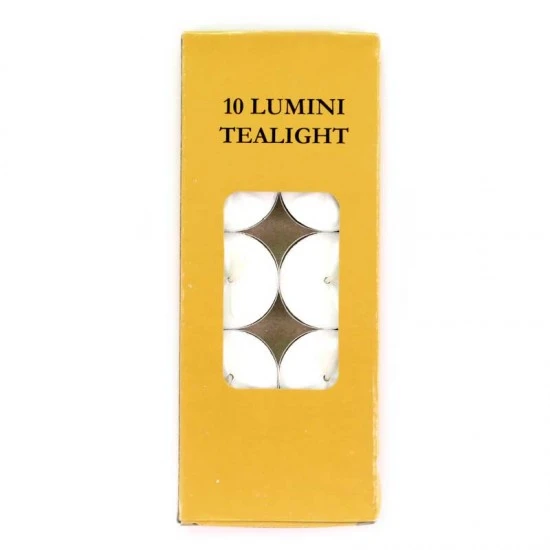 Lumini votivi in cera bianca tondi in contenitore di alluminio. Confezione composta da 10 pezzi contenuti in scatola di cartone.