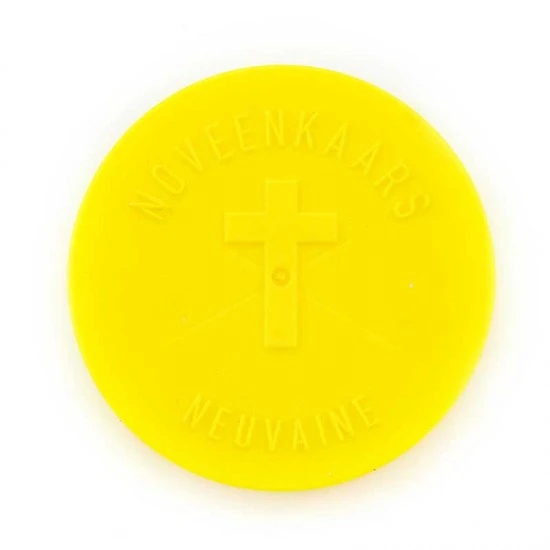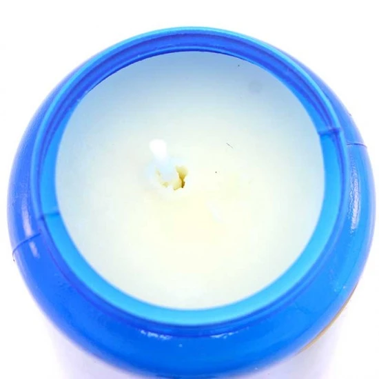 Lumino in cera francese con contenitore in plastica blu e tappo giallo. La durata di 10 giorni (circa) è garantita dalla qualità della cera.