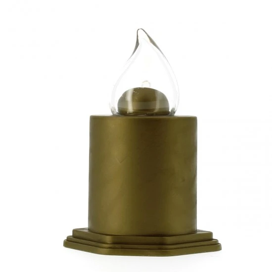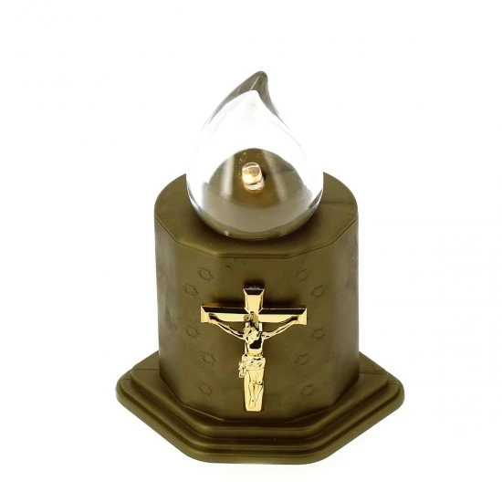 Lumino votivo elettronico realizzato in plastica color bronzo e decorato da crocifisso dorato sul fronte, luce led di colore giallo che simula l’effetto tremolante della fiamma della candela. Funziona con due batterie ministilo sostituibili (incluse) ed è munito di interruttore di spegnimento. Made in Italy