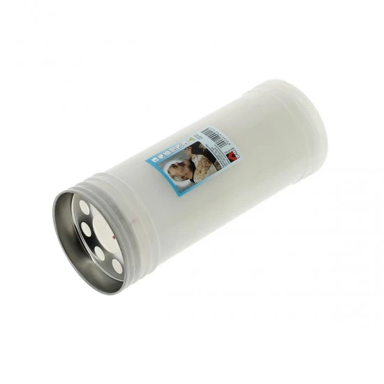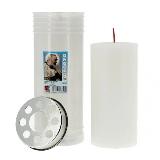 Lumino votivo in cera bianca con contenitore in plastica bianca e immagine di Padre Pio. La durata di circa 6 giorni è garantita dalla buona qualità della cera. Made in Italy