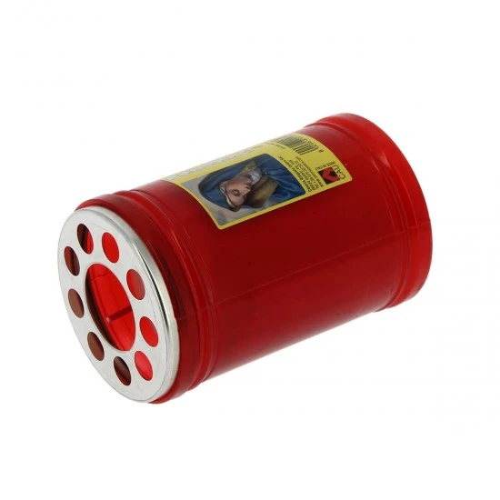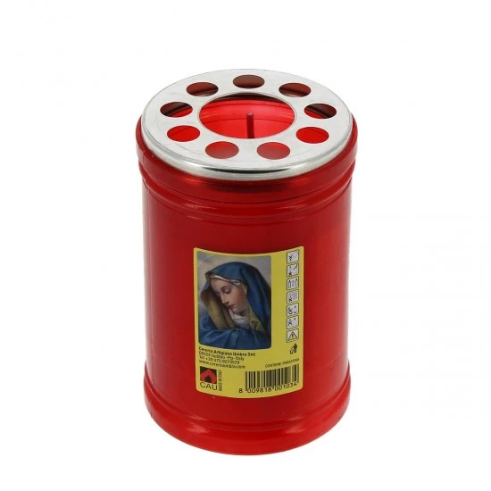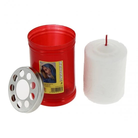 Lumino votivo in cera bianca con contenitore in plastica rosso e immagine della Madonna Addolorata. La durata di circa 36 ore è garantita dalla buona qualità della cera. Made in Italy