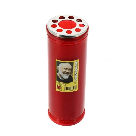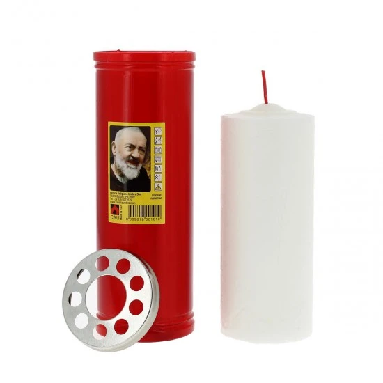 Lumino votivo in cera bianca con contenitore in plastica rosso e immagine di San Pio. La durata del lumino è di circa 4 giorni, garantita dalla buona qualità della cera. Made in Italy