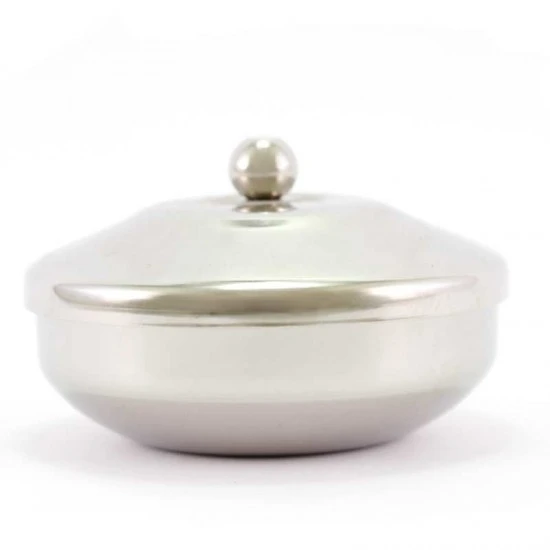Navetta per incenso di dimensioni molto piccole adatta per spostamenti. Realizzata interamente in metallo liscio color nichelato, munita di coperchio apribile tramite piccolo pomello.