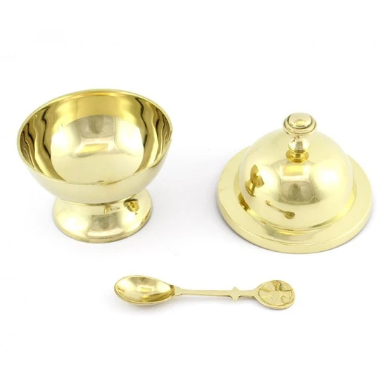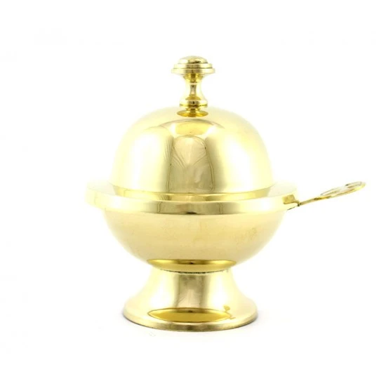 Navetta Sfera con pomo realizzata in metallo dorato martellato. Coperchio apribile con pomo superiore, fornita completa di cucchiaino utile per sistemare l’incenso sul carbone.