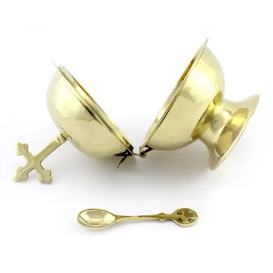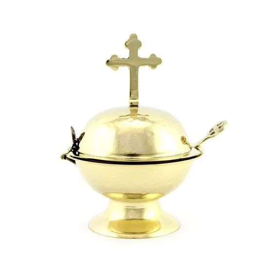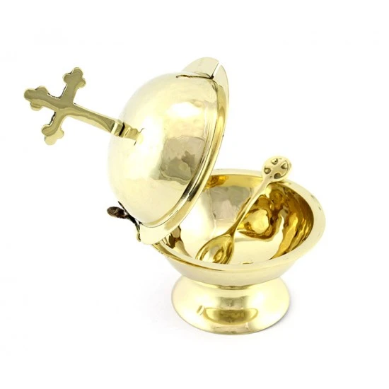 Navetta Sfera realizzata in metallo dorato martellato. Coperchio apribile con piccola croce saldata, fornita completa di cucchiaino utile per sistemare l’incenso sul carbone.