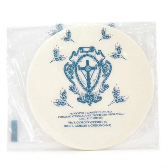 Ostia Magna di grandi dimensioni particolarmente adatta ad essere esposta all’interno della teca ostensorio. Questo prodotto delle Suore crocifisse adoratrici dell’eucarestia viene realizzato secondo il rispetto delle normative vigenti in materia di lavorazione dei prodotti alimentari che sono alla base per ottenere qualità e dare sicurezza ai consumatori. Prodotta con farina di qualità tipo 00 ed acqua. Made in Italy