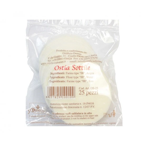Ostia Sottile per sacerdote. Questo prodotto della linea Domus viene realizzato secondo il rispetto delle normative vigenti in materia di lavorazione dei prodotti alimentari che sono alla base per ottenere qualità e dare sicurezza ai consumatori. Prodotta con farina di qualità tipo 00 ed acqua. Made in Italy