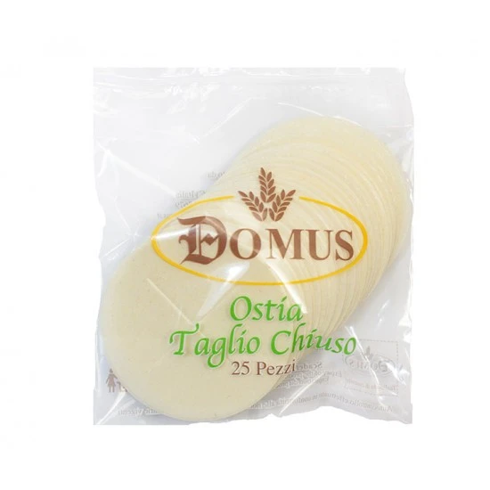 Ostia Taglio chiuso per sacerdote, novità del 2014. Questo nuovo prodotto della linea Domus viene realizzato secondo il rispetto delle normative vigenti in materia di lavorazione dei prodotti alimentari che sono alla base per ottenere qualità e dare sicurezza ai consumatori. Prodotta con farina di qualità tipo 00 ed acqua. Made in Italy