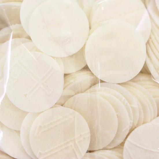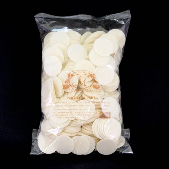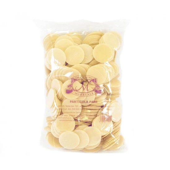 Particola Pane per la comunione dei fedeli. Prodotto della linea Morreale realizzato secondo il rispetto delle normative vigenti in materia di lavorazione dei prodotti alimentari che sono alla base per ottenere qualità e dare sicurezza ai consumatori. Made in Italy