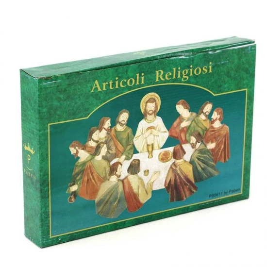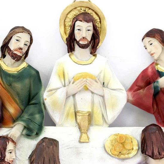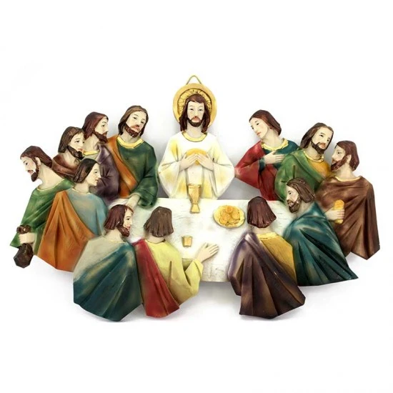 Placca Ultima Cena da appendere realizzata interamente in resina colorata con colori molto tenui. Prodotto di ottima fattura e ben rifinito nei particolari, confezionato in elegante scatola di cartone litografato con imballaggio sicuro per il trasporto.