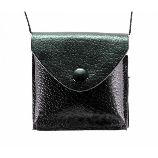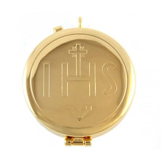 Portateca con teca IHS realizzato in similpelle nera con interno in tessuto bianco e munito di cordino. Il portateca contiene la teca di diametro 5,4 cm realizzata in metallo dorato con incisione del simbolo IHS. Made in Italy