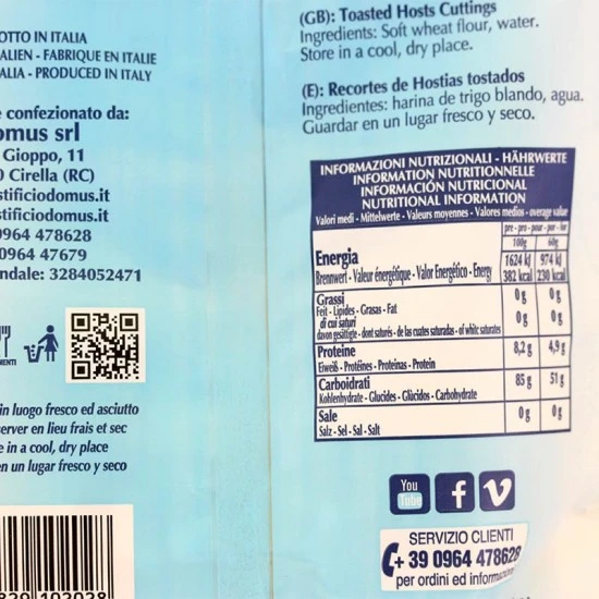 Ritagli di Ostie croccanti, prodotto della linea Morreale realizzato secondo il rispetto delle normative vigenti in materia di lavorazione dei prodotti alimentari che sono alla base per ottenere qualità e dare sicurezza ai consumatori. Made in Italy