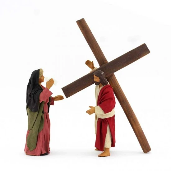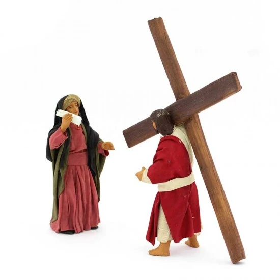 Stupenda raffigurazione di due scene della Via Crucis, l’incontro con Veronica e la Crocifissione. Statuine realizzate in vera terracotta dipinte a mano e successivamente vestite con stoffa modellata sul pezzo da esperti artigiani che curano nel dettaglio ogni minimo particolare. Made in Italy