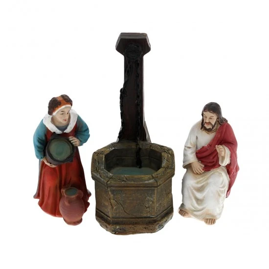 Scena raffigurante Gesù e la Samaritana al pozzo di Giacobbe, composta da 3 pezzi realizzati interamente in resina colorata effetto legno. Prodotto di ottima fattura e ben rifinito nei particolari, fornito confezionato in scatola di cartone.