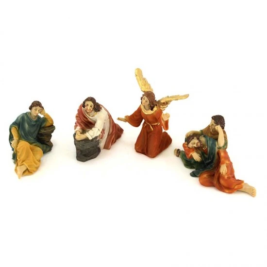 Scena raffigurante Gesù che prega nel giardino degli olivi, composta da 4 statuine realizzate interamente in resina colorata effetto legno. Prodotto di ottima fattura e ben rifinito, fornito confezionato in scatola di cartone.