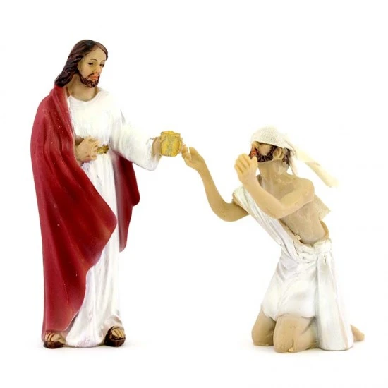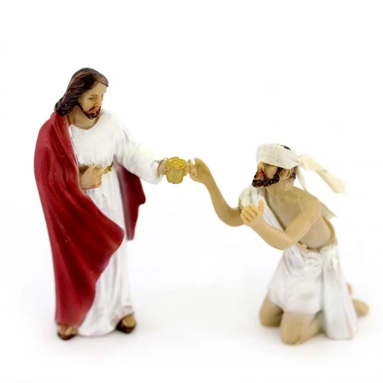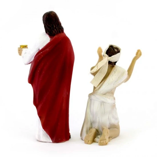 Scena raffigurante la guarigione del cieco, realizzata interamente in resina colorata effetto legno. Prodotto di ottima fattura e ben rifinito, fornito confezionato in scatola di cartone.