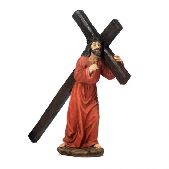 Scena passione di Cristo raffigurante la salita al Calvario, composta da 4 statuine realizzate interamente in resina colorata effetto legno. Prodotto di ottima fattura e ben rifinito nei particolari, fornito confezionato in scatola di cartone litografato.