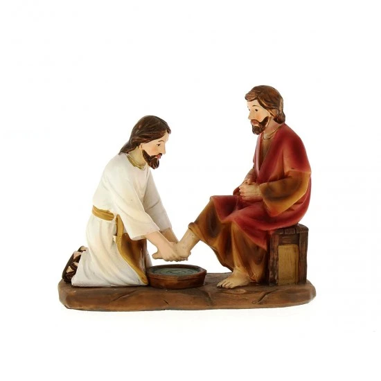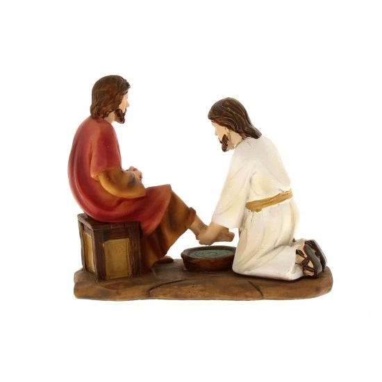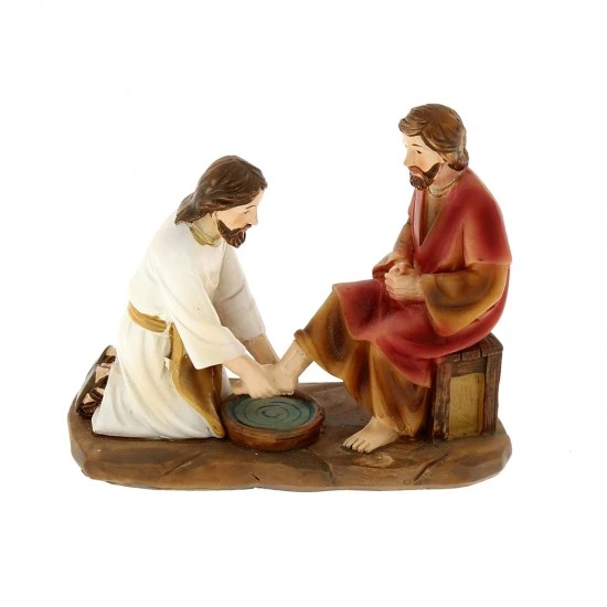 Scena vita di Gesù raffigurante la Lavanda dei piedi, composta da 3 statuine realizzate interamente in resina colorata. Prodotto di ottima fattura e ben rifinito nei particolari, fornito confezionato in scatola di cartone.